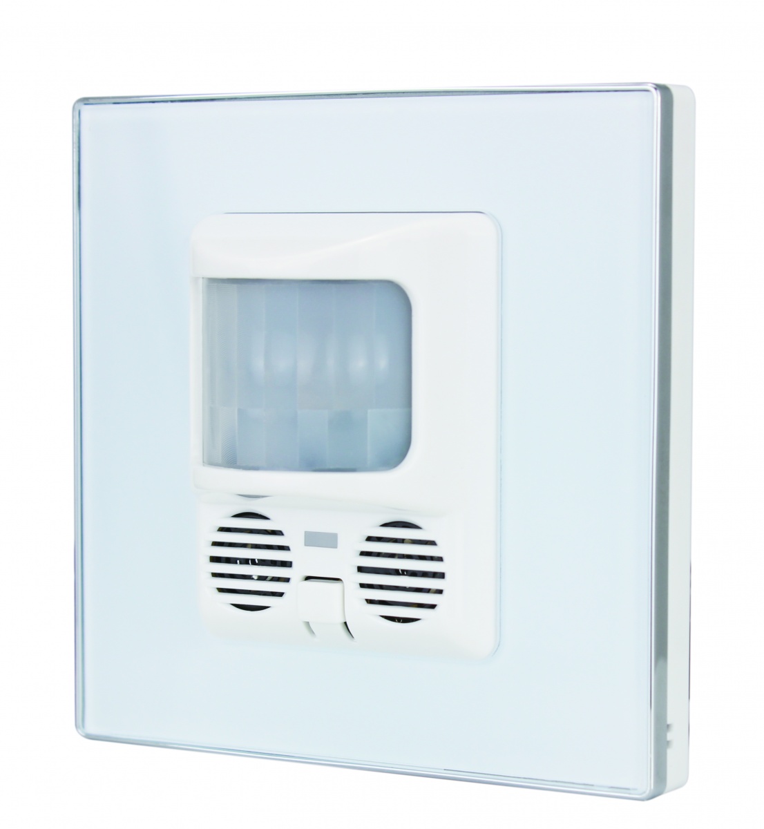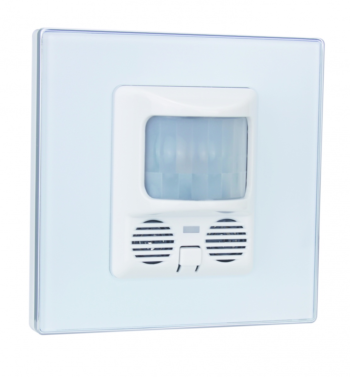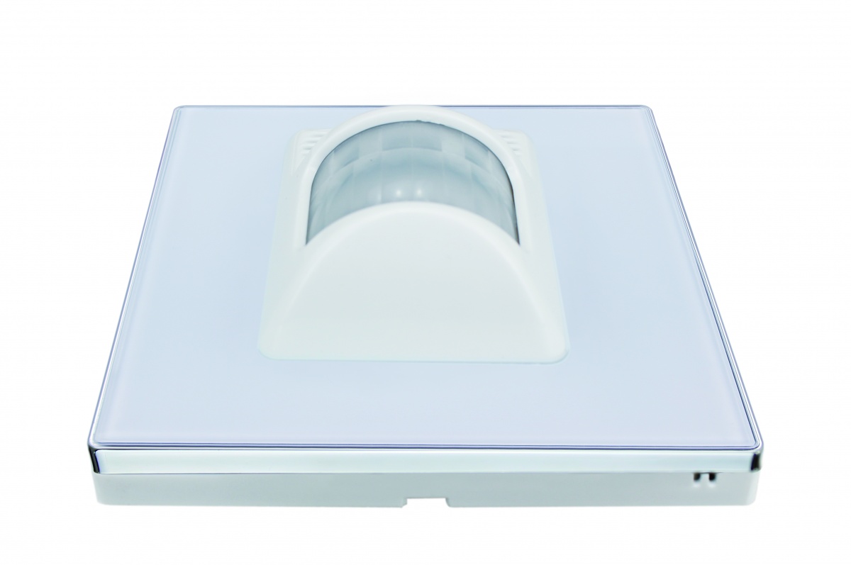 Настенный универсальный сенсор с нажимной клавишей (датчик движения, ультразвуковой сенсор присутствия, сенсор уровня света, сенсор температуры, 32 логических блока, под стандартную монтажную коробку европейского стандарта (белое или черное стекло)